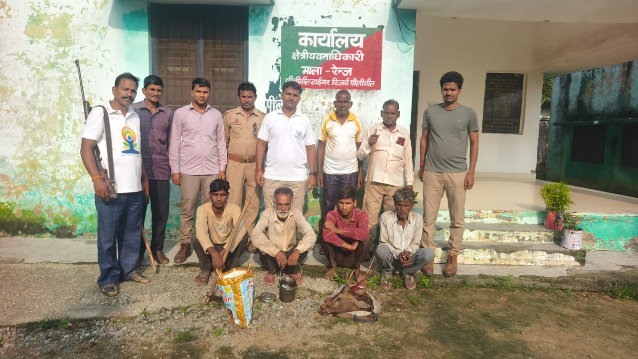 पीलीभीत टाइगर रिजर्व (PTR) क्षेत्र में वन विभाग ने शिकारियों के खिलाफ सख्त कार्रवाई करते हुए जंगल के अंदर हिरण का शिकार करते चार शिकारियों को रंगे हाथों गिरफ्तार किया। उनके कब्जे से हिरण की खाल, सींग और लगभग 500-500 ग्राम मांस बरामद हुआ।