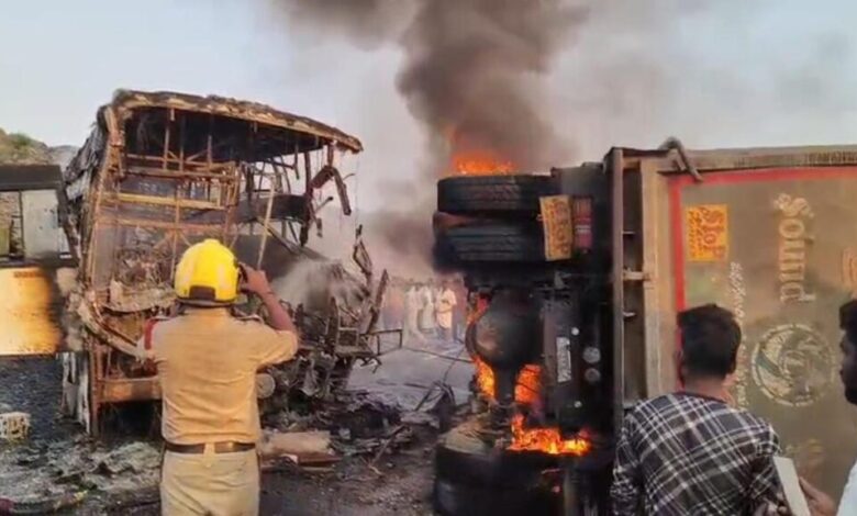 आंध्र प्रदेश के प्रकाशम जिले में गुरुवार को एक दिल दहला देने वाली सड़क दुर्घटना हुई, जिसमें 13 लोगों की जान चली गई और 20 अन्य गंभीर रूप से घायल हो गए। यह दर्दनाक हादसा रायवरम के पास उस समय हुआ जब तेलंगाना के निर्मल से नेल्लोर जा रही ‘हरिकृष्णा ट्रैवल्स’ की एक प्राइवेट बस की टक्कर सामने से आ रही टिपर लॉरी से हो गई। टक्कर इतनी भीषण थी कि बस में तुरंत आग लग गई और देखते ही देखते पूरी बस जलकर खाक हो गई। अधिकारियों ने आशंका जताई है कि आग की लपटों के कारण कई यात्रियों की मौके पर ही जिंदा जलने से मौत हुई है।
