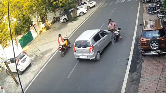 उत्तर प्रदेश के झांसी में एक तेज रफ्तार कार ने स्कूटर सवार दो युवकों को जोरदार टक्कर मार दी, जिससे वे गंभीर रूप से घायल हो गए। घटना गुरुवार दोपहर करीब 4 बजे नौबाद इलाके के वन विभाग कार्यालय के पास हुई, जो पास लगे सीसीटीवी कैमरे में कैद हो गई। यह भयावह वीडियो सोशल मीडिया पर वायरल हो चुका है।